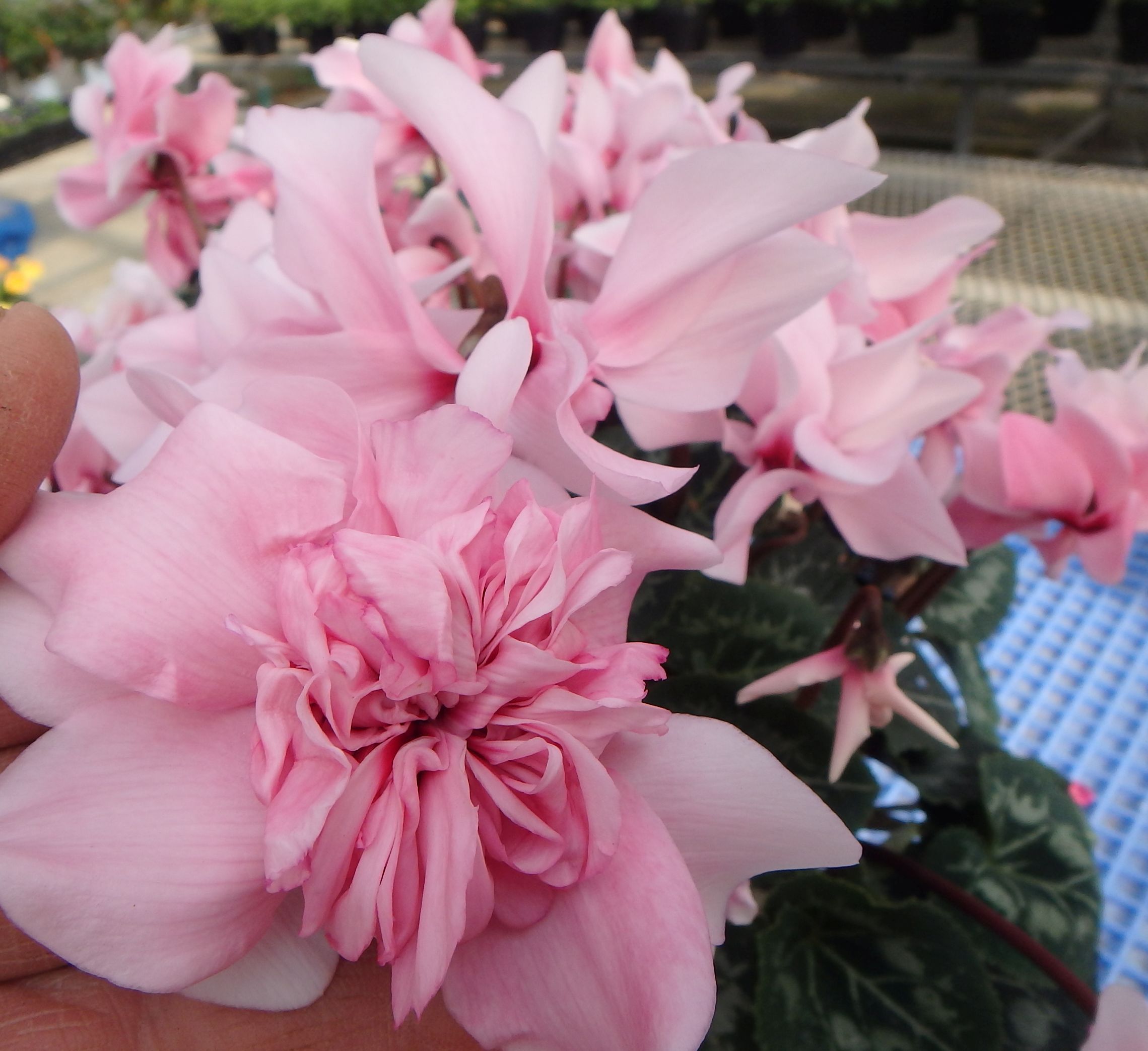 ・八重咲ミニシクラメン【チモ】はミニシクラメンの中に極まれに八重咲があることに気づいた時から20数年交配を繰り返して生まれた品種です。【チモシリーズ】は八重咲で種が付かないことで、種にいく力を塊茎に蓄えることができます。そのために、夏越しが楽にできて秋から春まで花を長く楽しめる品種です。
